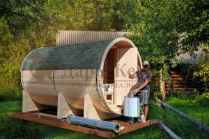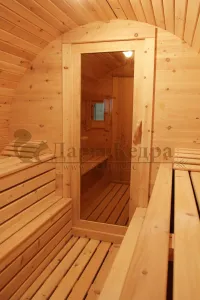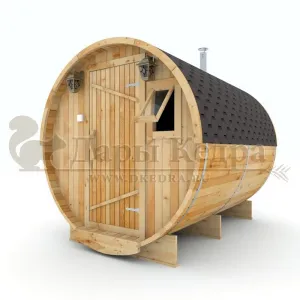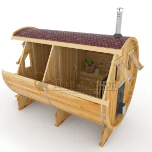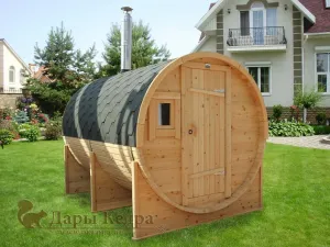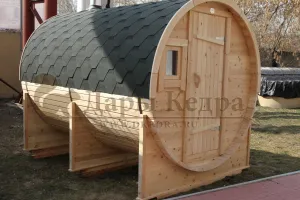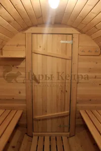 Это изделие круглой вытянутой формы с двумя отделениями: раздевалкой и парной. Лавочки из кедра находятся по всей длине бани-бочки с обеих сторон. Печь расположена в парилке около дальней стены. Для удобства пользования в раздевалке установлена вешалка и полочка из кедра. За счет небольшой конструкции баня нагревается не более 30 минут. По вашему желанию баню-бочку можно дополнить печью с внешней загрузкой, благодаря которой весь мусор после топки останется на улице. Круглая баня-бочка не требует полноценный фундамент, поэтому при необходимости ее можно перенести в другое место.