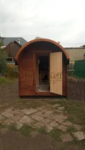 Баня-буханка более просторная за счет увеличенной высоты потолков и ровного пола. Козырек не только украшает баню, но и защищает оставленную обувь от дождя. Лавочки из кедра находятся по всей длине бани-бочки с обеих сторон. Печь расположена в парилке около дальней стены. Время растопки такой бани не превышает 30 минут. В зависимости от выбранного размера баня-бочка буханка с козырьком имеет следующую комплектацию: