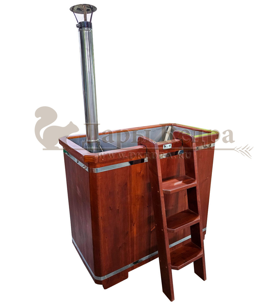 • Фурако прямоугольная с металлической вставкой и встроенной печью Фурако со встроенной металлической чашей, печью и внешней отделкой из массива кедра - это уличная баня, которой можно пользоваться круглый год. Купель представляет собой прямоугольную емкость для воды, внутри которой располагается сиденье и трап для ног из кедра. Нагрев воды происходит за счет встроенной печи, которая находится внутри купели за перегородкой. Рекомендуем приобрести термокрышку и весло для перемешивания воды для ускорения нагрева. Для удобства пользования японская баня фурако с металлической вставкой оборудована внешней и внутренней лестницей из кедра.
