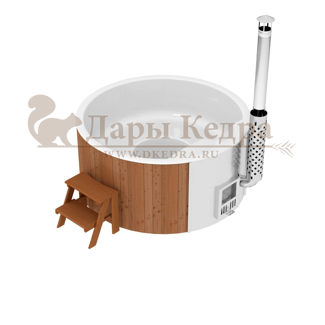 • Финская круглая композитная купель с подогревом (с печкой) «Премиум 220 30 квт» Это уличная подогреваемая купель с круглой внутренней чашей, которая изготовлена из современного прочного и термоустойчивого материала (композита). Форма чаши обеспечивает комфортную посадку во время принятия процедур. Для удобства пользования купель фурако оборудована приставной лестницей. Нагрев воды осуществляется за счет встроенной печи, которая находится внутри купели за перегородкой из кедра. В комплектацию этой модели входит савок с длинной ручкой, который позволяет извлекать угли после эксплуатации изделия. Композитная вставка придает купели красивый внешний вид, продлевает срок службы и облегчает уход за изделием. Парение на свежем воздухе – это отличный способ укрепить здоровье и поддержать организм в тонусе.