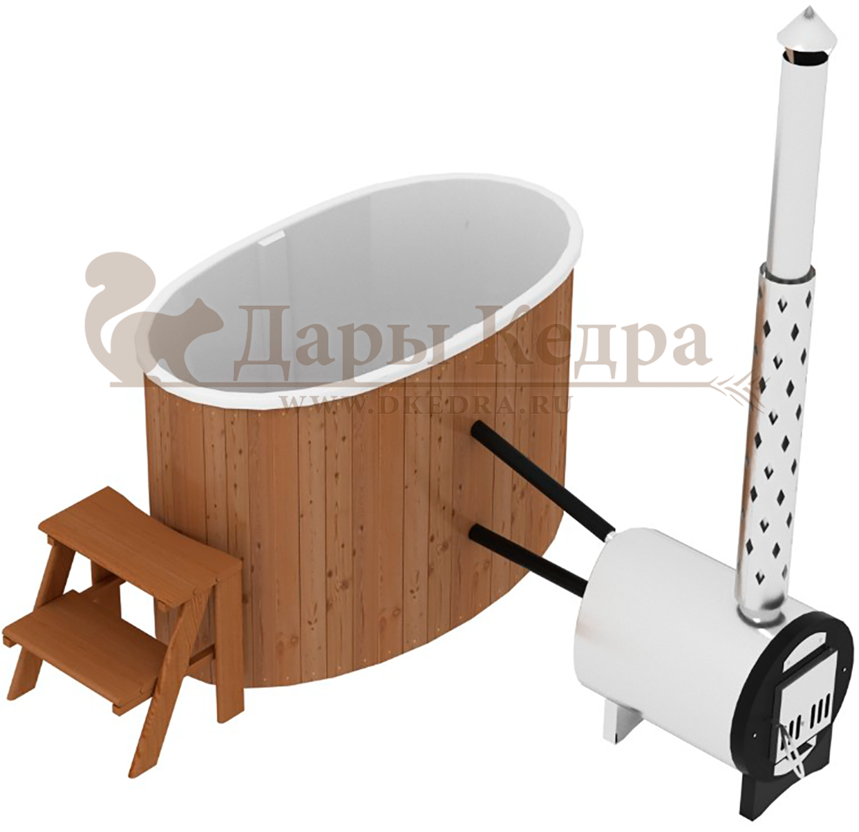 • Фурако овальная из кедра со встроенной печью Это уличная баня, которой можно пользоваться круглый год. Купель представляет собой овальную емкость для воды, внутри которой располагаются сиденья из кедра. Нагрев воды происходит за счет встроенной печи, которая находится внутри купели за перегородкой. Рекомендуем приобрести термокрышку и весло для перемешивания воды для ускорения нагрева. Для удобства пользования японская баня фурако оборудована внешней и внутренней лестницей из кедра. В комплектацию этой модели входит совок с длинной ручкой, который позволяет извлекать угли и золу после эксплуатации изделия. Целебная древесина кедра богата фитонцидами и эфирными маслами, которые активируются при нагревании. Таким образом, во время процедур парения организм насыщается полезными веществами.